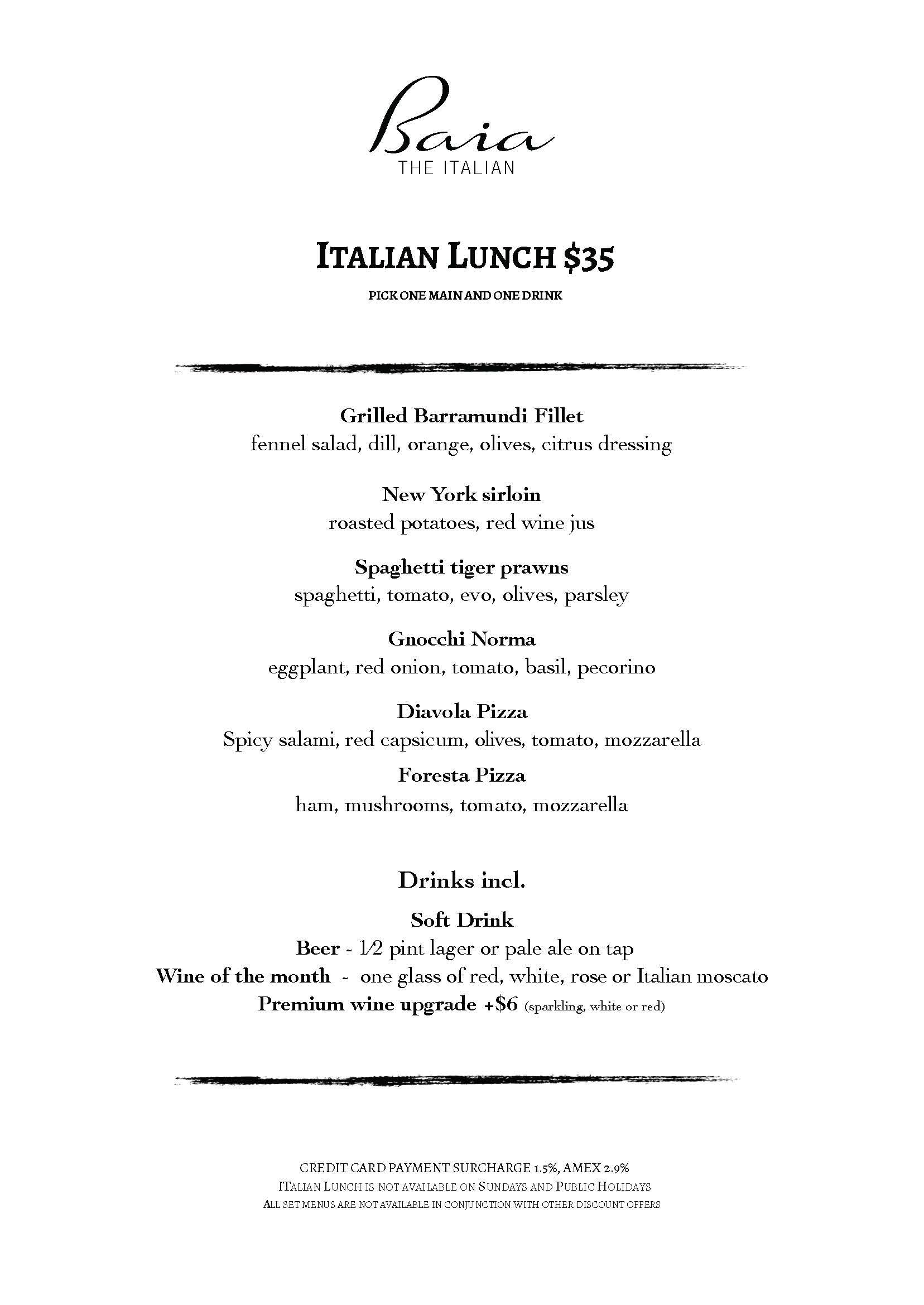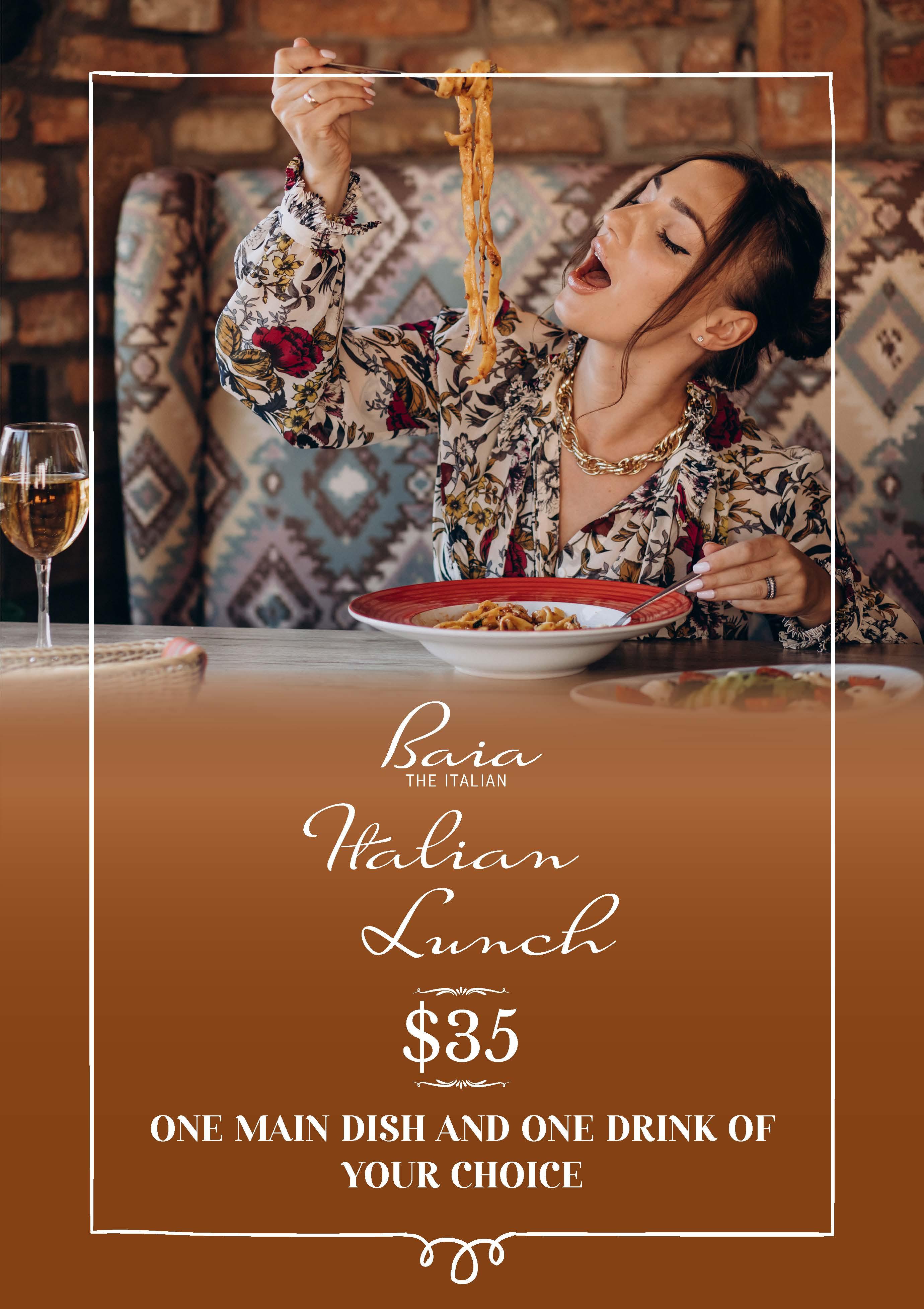 Take a midday escape to Baia the Italian with our irresistible lunch special: 1 selected main + 1 drink for just $35!